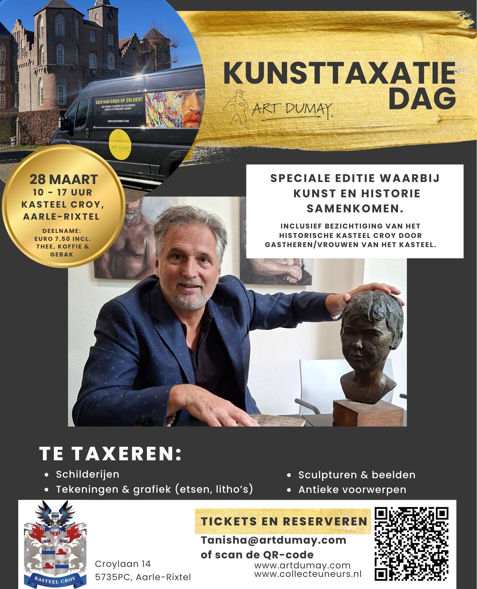 Kunst- en Antiek taxatiedagOp zaterdag 28 maart vormt het historische Kasteel Croy het decor voor een bijzondere Taxatiedag Kunst & Antiek van kunsthandel Art Dumay. Deze editie is een speciale gelegenheid waarbij kunst en historie samenkomen. Bezoekers kunnen tijdens deze dag hun schilderijen, tekeningen, grafiek, sculpturen en antieke voorwerpen laten beoordelen door ervaren taxateurs van Art Dumay. Zij geven inzicht in de herkomst, periode en mogelijke marktwaarde van de objecten. Voor deelnemers is er tevens de gelegenheid om het kasteel te bezichtigen. De gastheren en -vrouwen van Kasteel Croy verwelkomen bezoekers en vertellen graag meer over de rijke geschiedenis van het kasteel en zijn bewoners. De taxatiedag vindt plaats van 10.00 tot 17.00 uur aan de Croylaan 14 in Aarle-Rixtel. Een ticket kost €7,50 per taxatie (maximaal drie objecten) en is inclusief koffie, thee en gebak. Meer informatie en het reserveren van een tijdsslot kan via www.collectioneurs.nl onder Taxatiedagen.